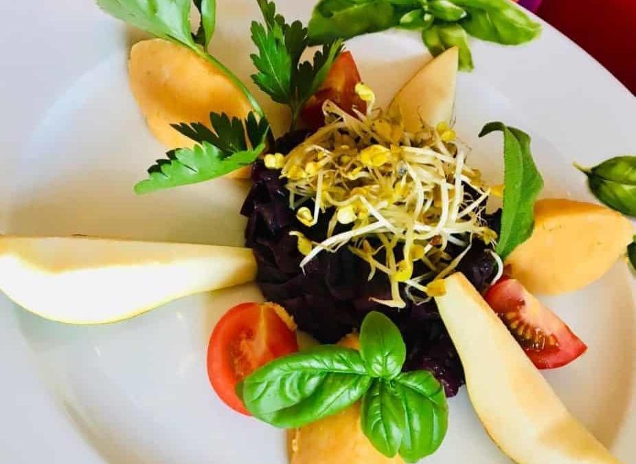 Serve the red cabbage and sweet potato puree as shown and garnish with radish sprouts, tomatoes, herbs and glazed pear. Enjoy your meal!