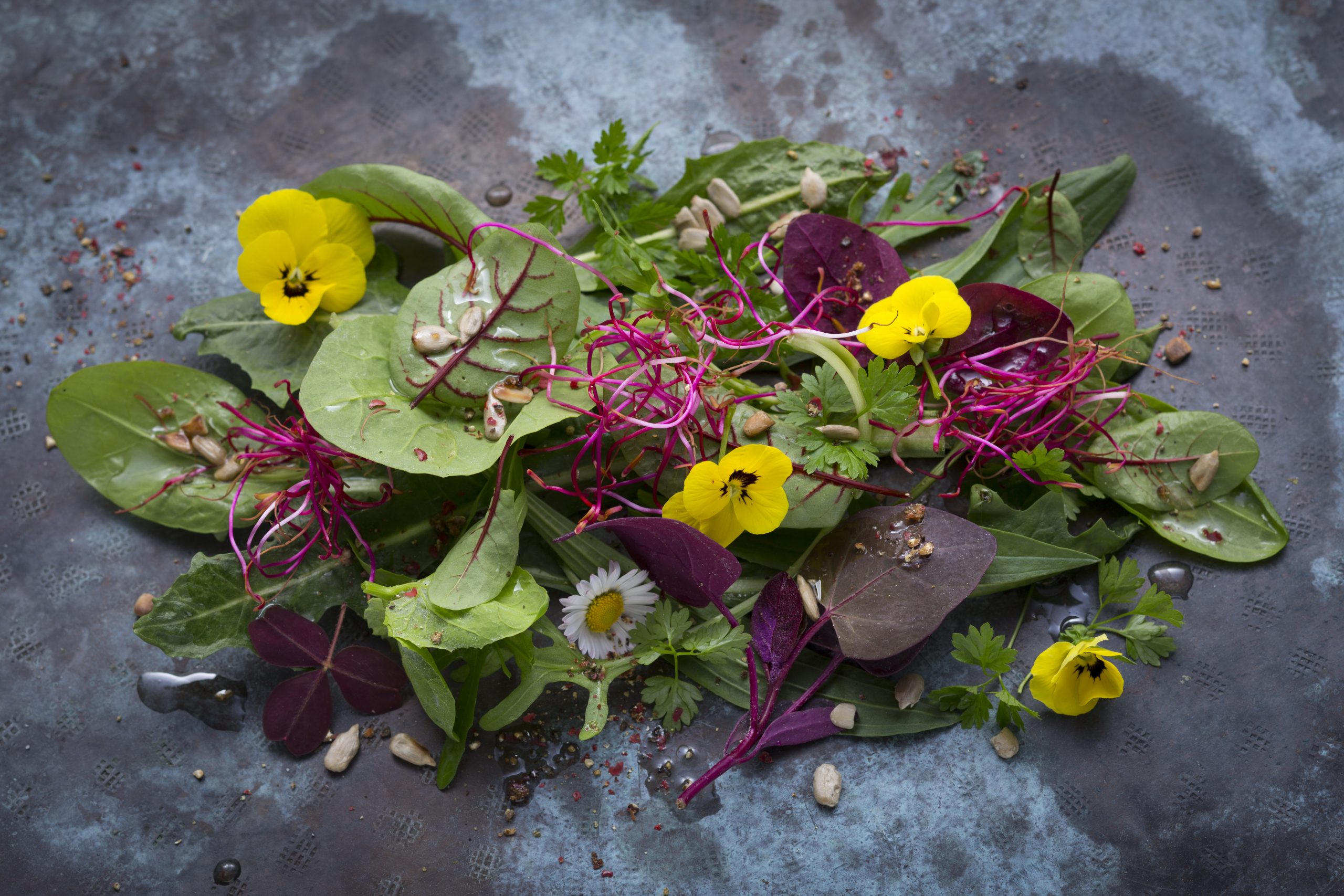 Bei Blattsalaten können Sie nebst den herkömmlichen Sorten aus dem Supermarkt auch nährstoffreiche Pflanzen nutzen, die fast jeder im Garten findet, z.B. Löwenzahn oder Brennnessel. Diesen Pflanzen werden viele gesundheitliche Vorteile nachgesagt, sie kosten nichts und sind meist schnell aufzufinden! Auch essbare Blüten können aus Salaten oder Gerichten echte Hingucker machen. Gänseblümchen sind essbar und oft leicht zu finden; Rosenblüten sind vor allem bei Desserts wunderschön; eine Zucchiniblüte passt auf gekochte oder gebratene Gemüsespeisen gut; und unzählige weitere Gartenblumen könnte man auch mit auf dem Teller präsentieren. Gehen Sie ruhig raus und googlen, was Sie finden!