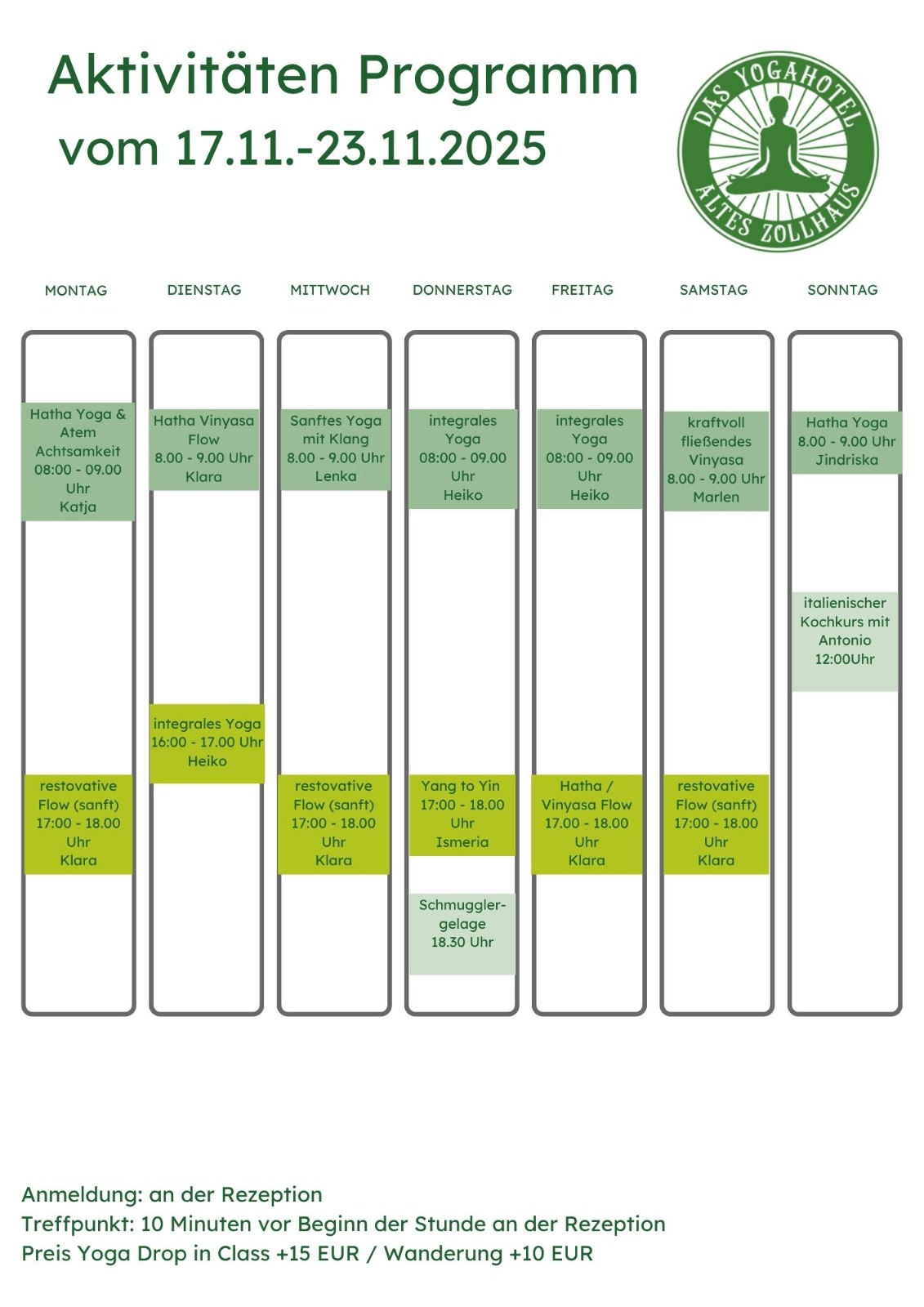 – 2 Yoga Stunden / Aktivitäten am Tag (08:00 und 17:00 Uhr)