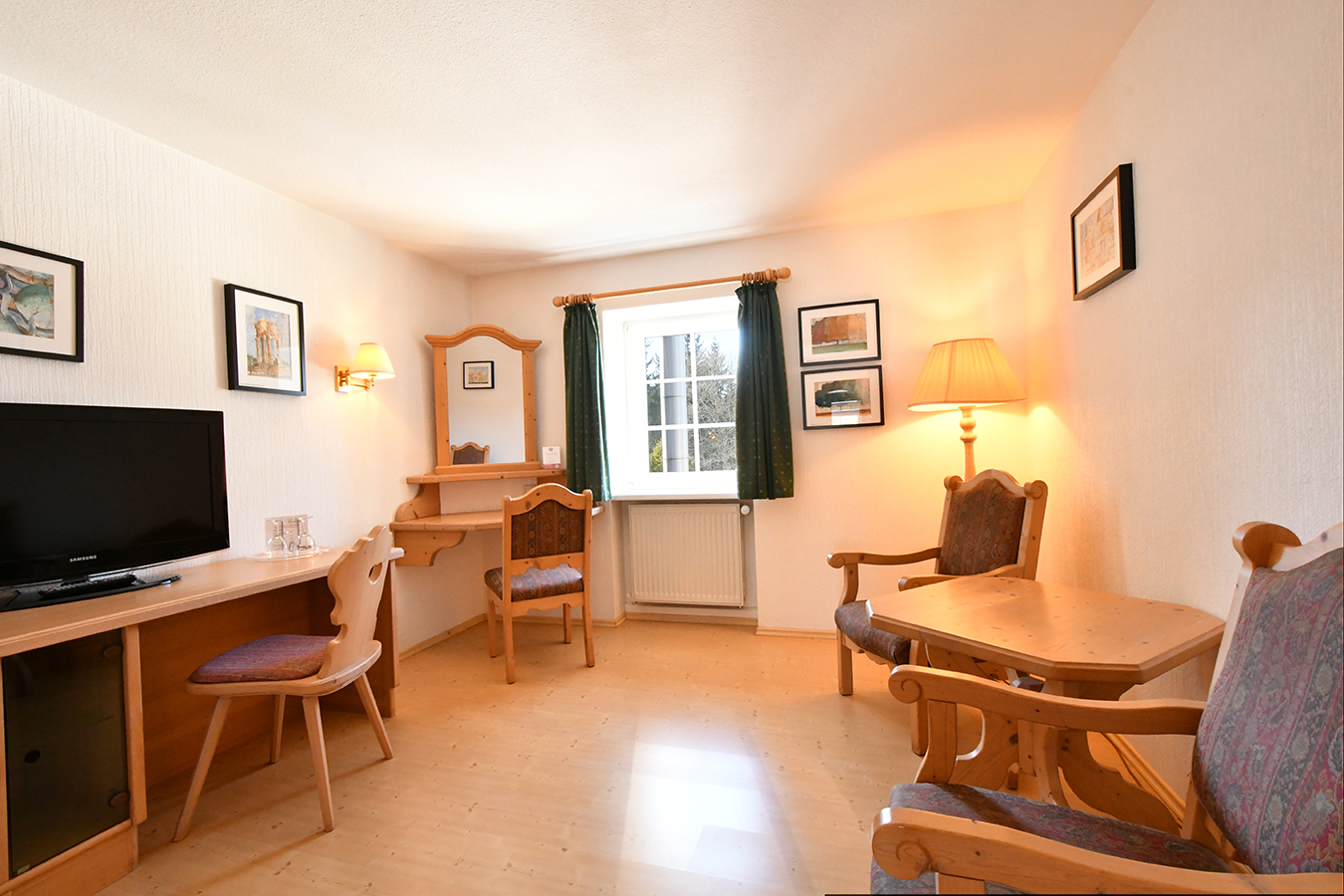 28 m² Zimmer mit fantastischem Waldblick gemütliche und großzügige Sitzecke kostenfreies WLAN, Flatscreen-TV, Telefon Bad mit Dusche, WC, Kosmetikspiegel, Föhn und Bademänteln.